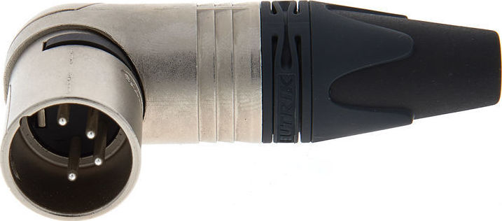 Кабельный разъем XLR, 4-х контактный <штекер/папа>, угловой, RX-серия, 7 положений вывода кабеля, металлический никелированный корпус, контакты - покрытие серебро, под пайку, полиуретановый колпачок на кабель диаметром (3.5-8.0 мм)