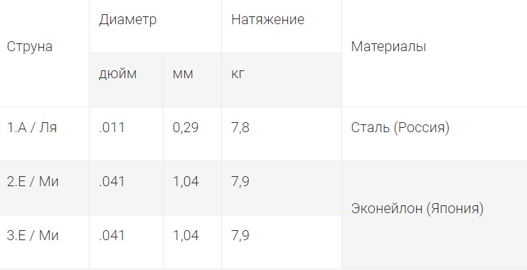 Первая струна «ля» изготовлена из прецизионной, «музыкальной» стали, и имеет заделку петли из нити красного цвета со спиралью из посеребренной проволоки.