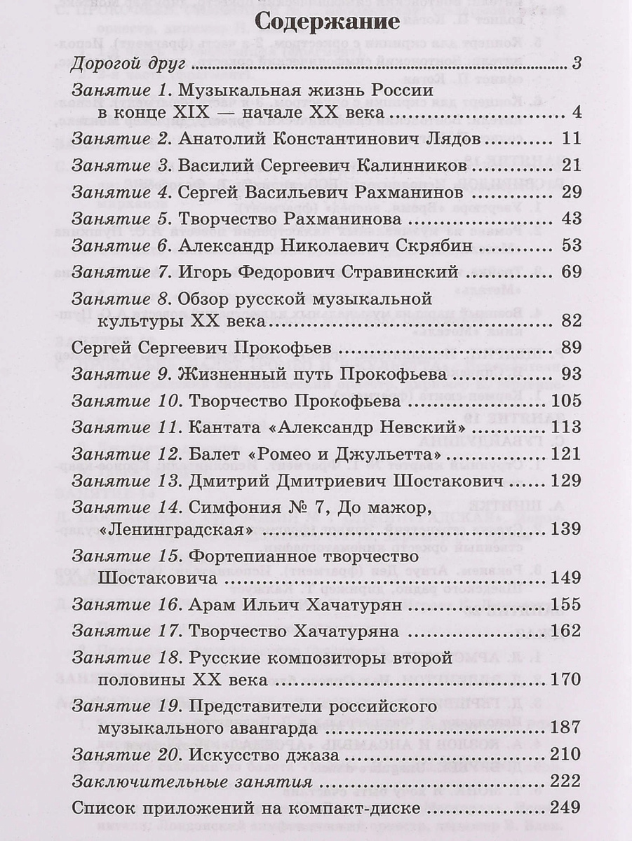 Самые существенные изменения в этих программах коснулись русской музыки XX века. Поэтому в пособие, помимо традиционных тем, вошло освещение жизни и творчества композиторов рубежа XIX и XX веков А. Лядова, В. Калинникова, С. Рахманинова, А. Скрябина, И. Стравинского. В государственной программе никак не затрагивается музыка композиторов второй половины XX в. В данное пособие включены разделы, посвященные Г. Свиридову, Р. Щедрину, а также обзорное занятие о представителях российского авангарда Э. Денисове, С. Губайдулиной и А. Шнитке. Последние главы пособия - краткий обзор развития джаза и небольшой словарь джазовых терминов.