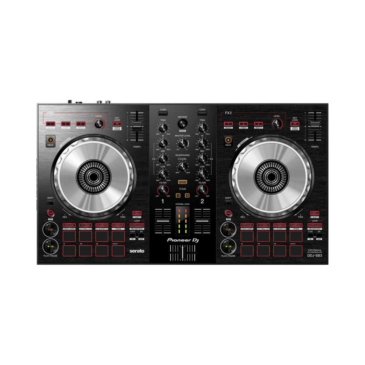 Параметры эффектов: 3 кнопки / сэмплер: 4 на каждую деку