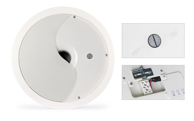 Потолочный сабвуфером с круглой решеткой и корпусом из огнеупорной стали.