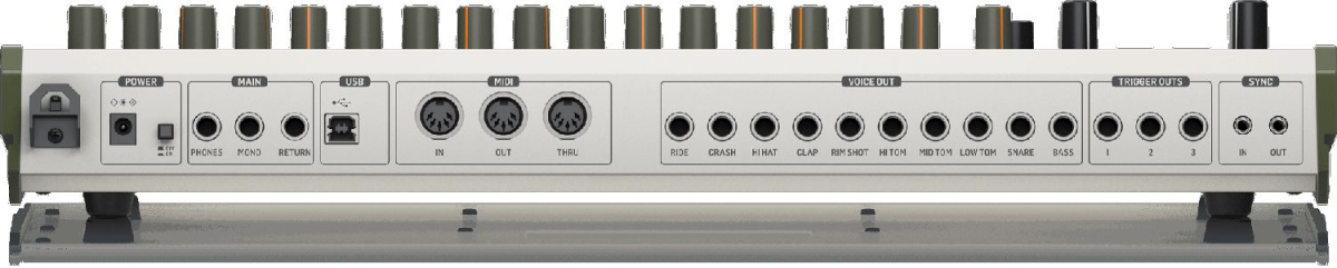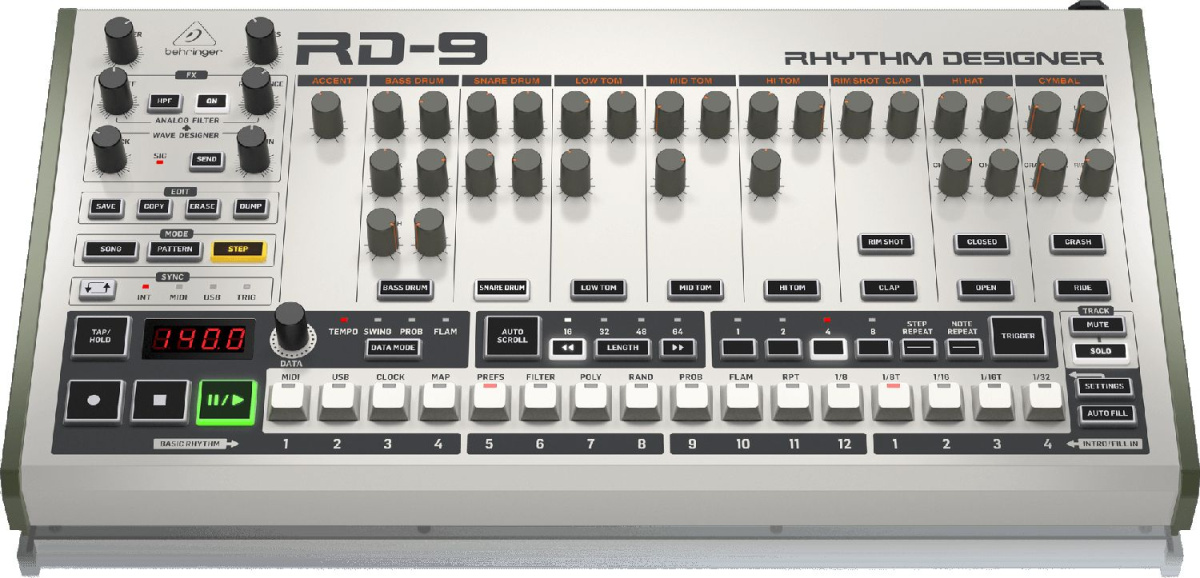 Классическая аналоговая драм-машина с 10 звуками барабанов, 64-шаговым секвенсором и 2-х режимным фильтром