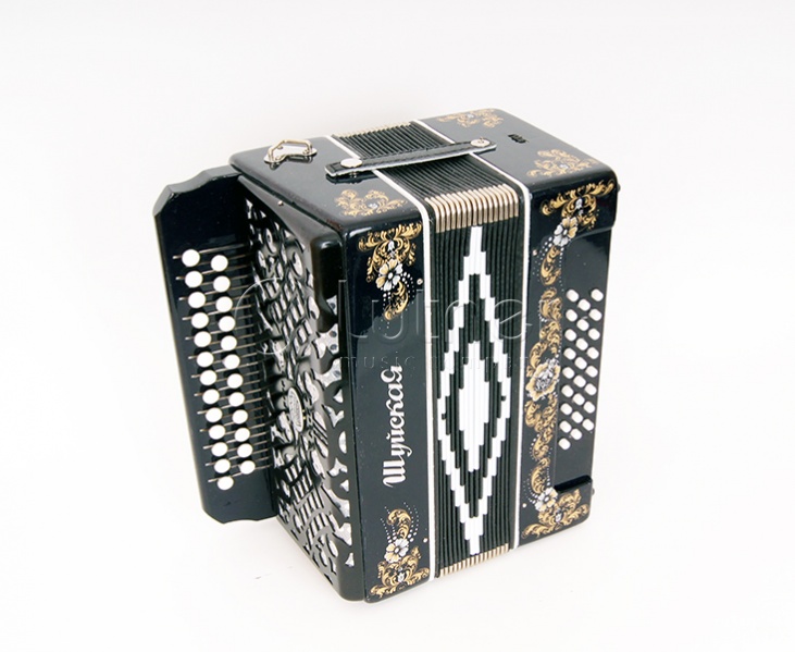 Трехголосая гармонь с регистром, звукоряд основан на неполной хроматической гамме.