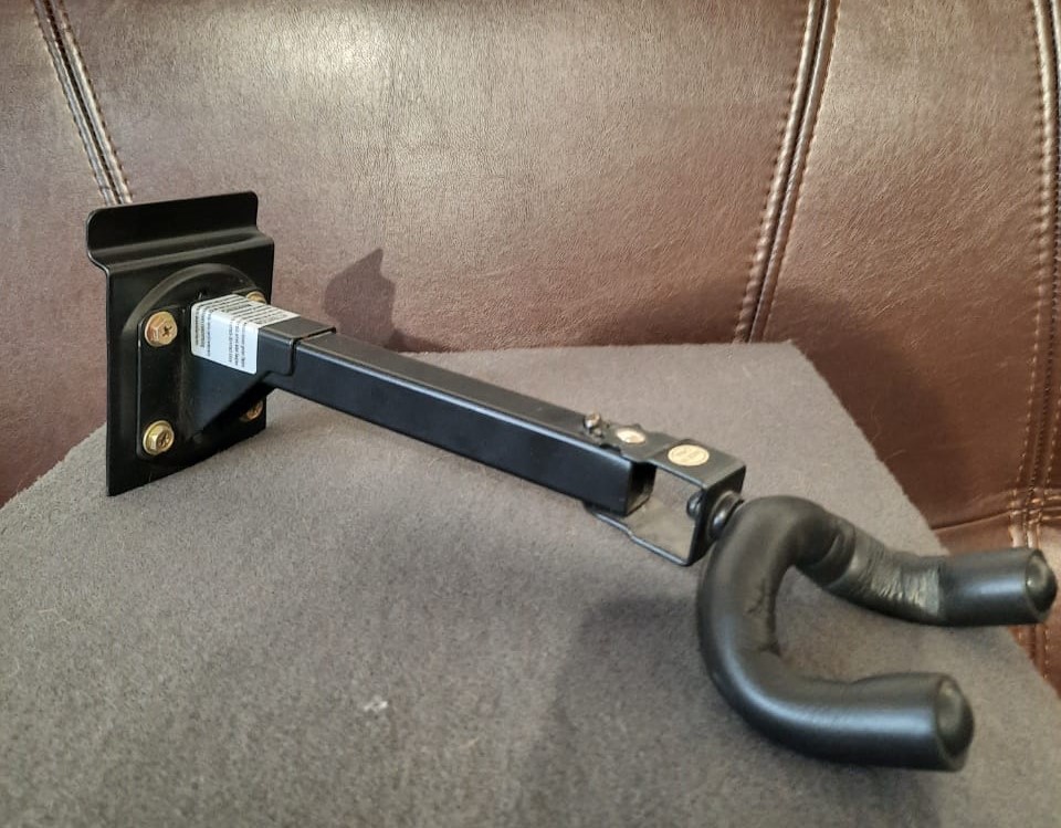 Настенный держатель для гитары, черный. Крепится на стену или на эконом-панель. Шарнирное соединение, 5 позиций, расстояние до грифа от стены 21см.