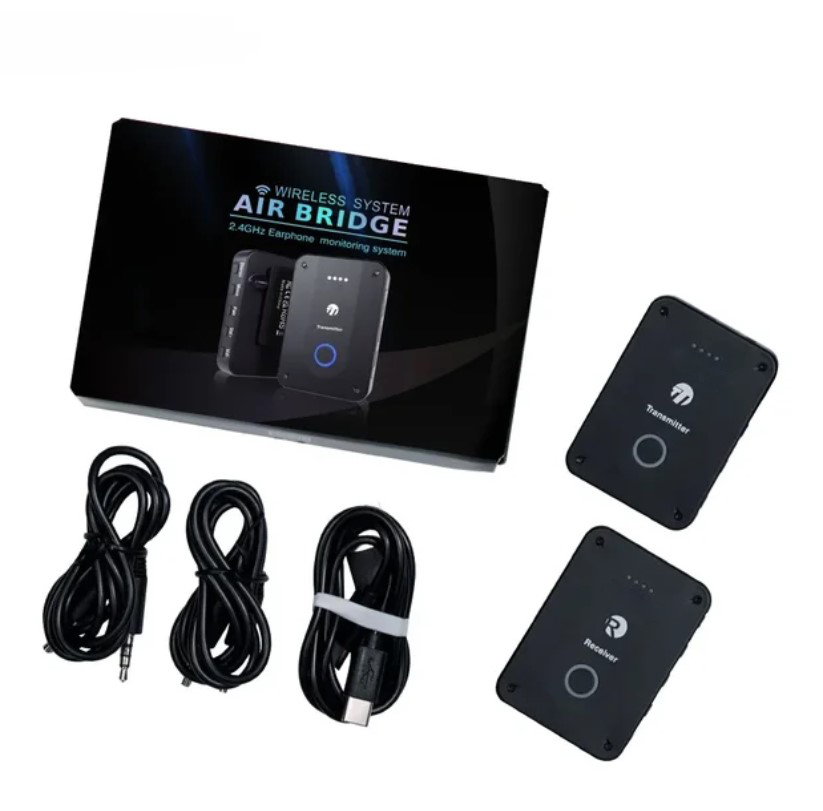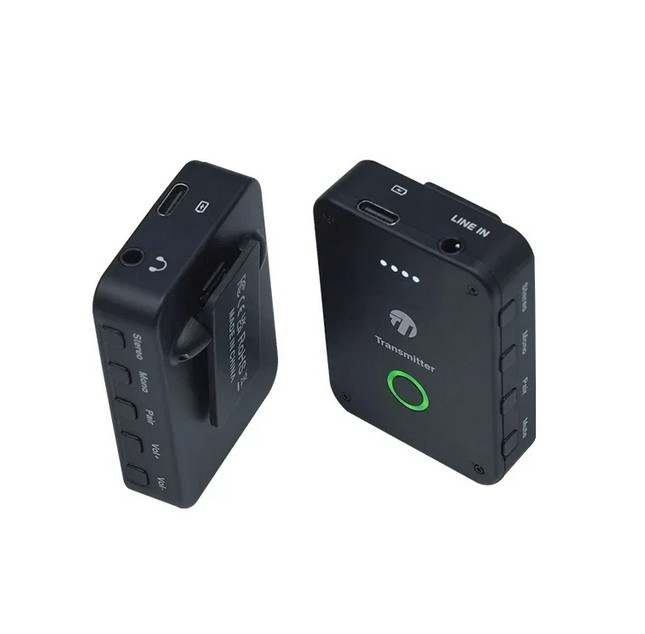 Аксессуары в комплекте: передатчик x1, приёмник, USB-кабель для зарядки x1, аудиокабель x2
