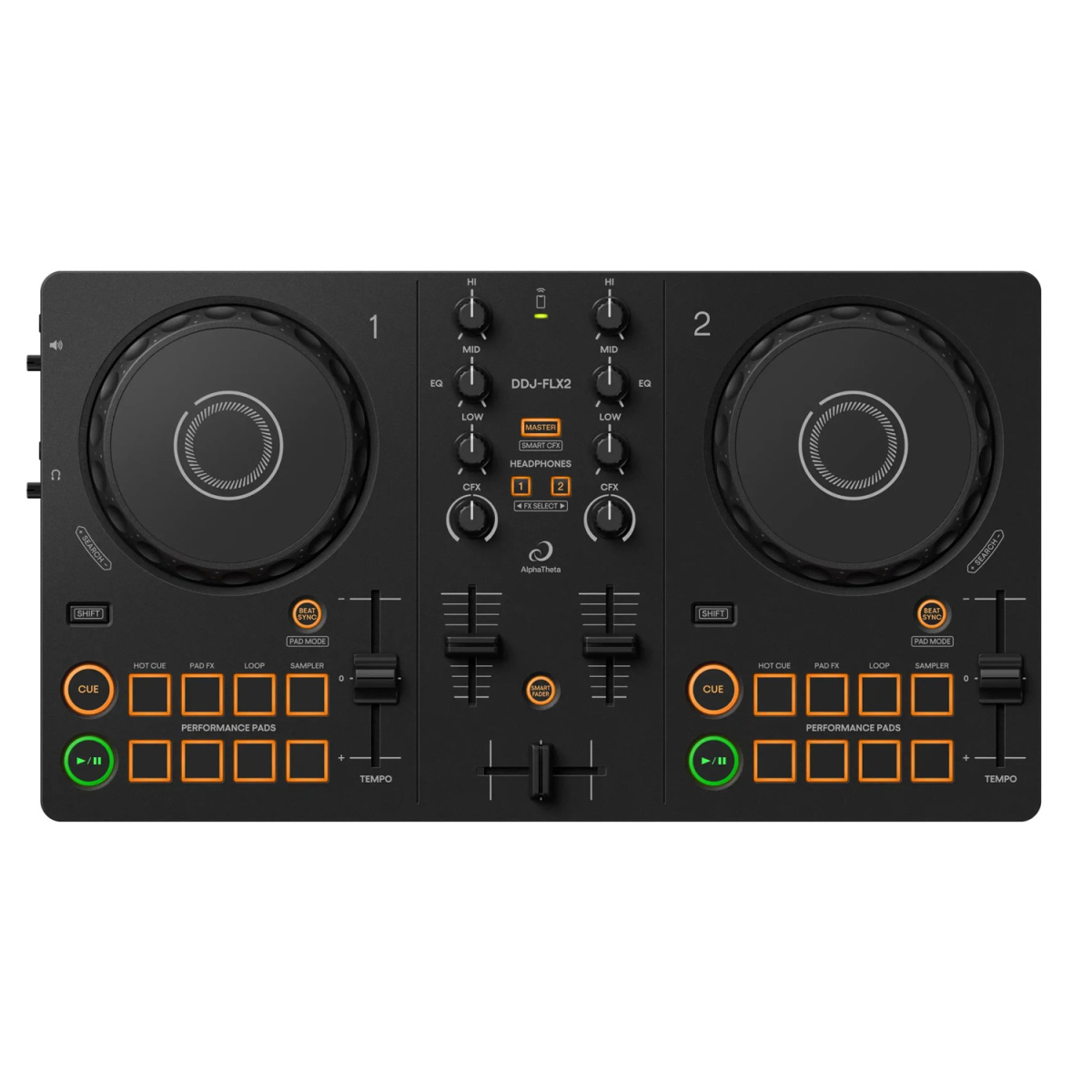 AlphaTheta DDJ-FLX2 - 2-канальный DJ-контроллер с питанием от шины USB-C, Bluetooth и совместимостью с Rekordbox, Serato и djay. Контроллер подойдет для диджеинга с вашего мобильного или настольного устройства. Просто установите Rekordbox, Serato или djay на свое устройство, подключите его через USB-C или Bluetooth, и вы готовы к игре. Кроме того, DDJ-FLX2 предлагает совместимость с рядом потоковых сервисов, включая Beatport, Apple Music, Beatsource, TIDAL и Soundcloud Go+/DJ. Между тем, у вас есть доступ к профессиональным диджейским эффектам с функциями Smart CFX и Smart Fader.