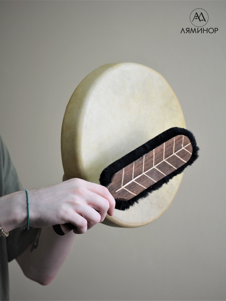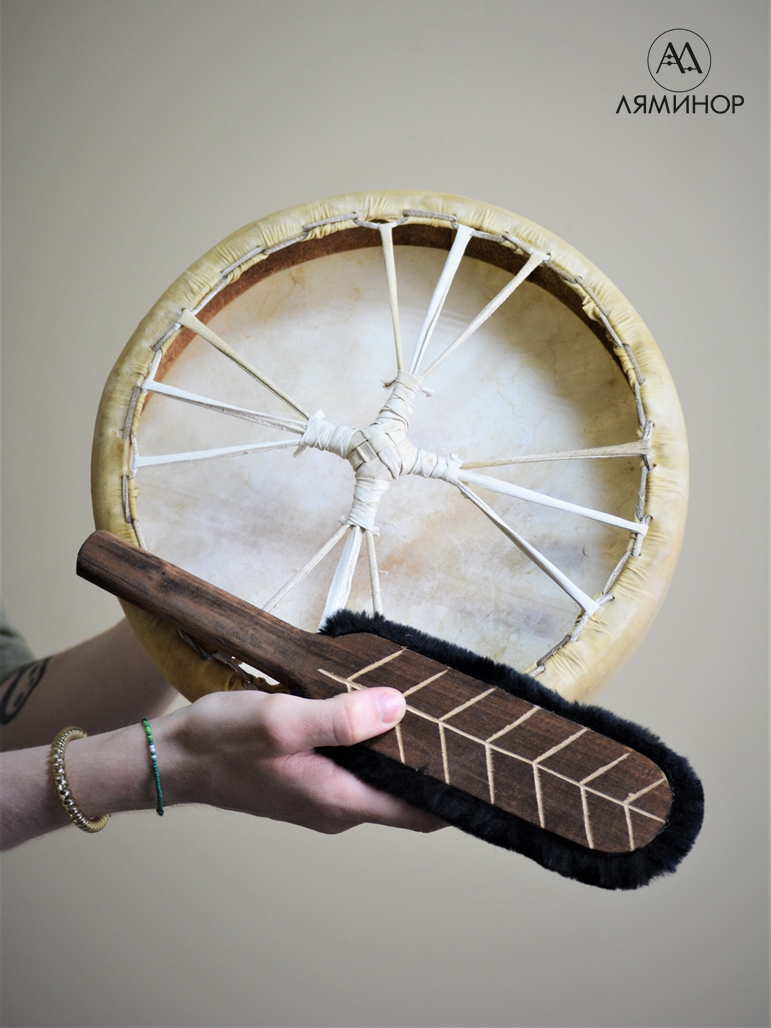 Бубен шаманский мастеровой круглый, диаметр 30 см, с колотушкой.