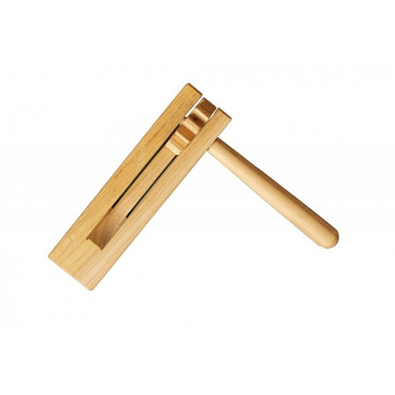 Данная модель сделана из дерева и представляет собой прямоугольную пластину с выемками, в которые помещена шестеренка, прикрепленная к удобной ручке. Трещотка проста и легка в обращении, подойдет для игр с детьми.