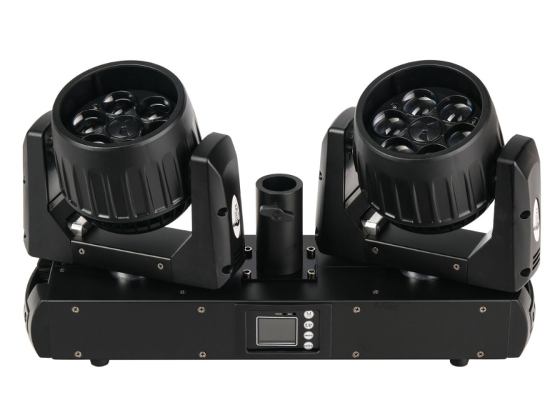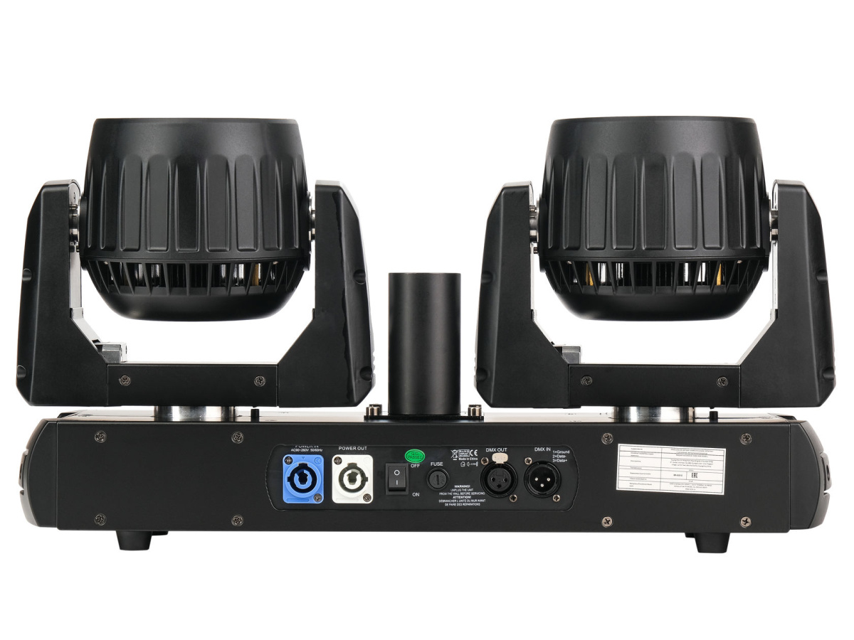 Двойная моторизированная световая "голова" мощностью 6х15 Вт предварительно смонтирована на одной штанге, которая крепится к ферме или штативу или просто устанавливается на пол, что идеально подходит для мобильного применения.